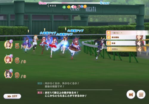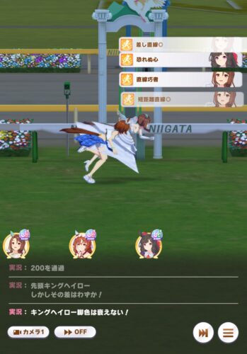 対象的に、キングが接続しまくってバンブー抜いて逃げに迫る。逃げも抜き去るが、終盤スキル発動したバンブーが迫ってきて