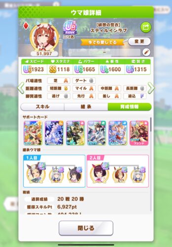 スティルは固有と衝動以外無効なので趣味枠のつもりでしたが、意外と戦えたりします。短距離で紛れやすいということもありますが、根性ルビーの力が相当強いようです。